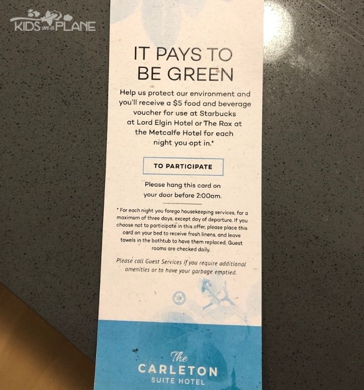 Also, be sure to take advantage of the Starbucks / The Rox offer. Every night that you opt out of housekeeping, you’ll receive a $5 coupon for food or drink at Starbucks or The Rox (restaurant).